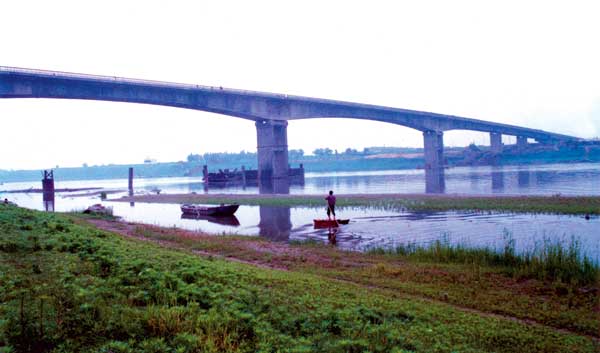 天門(mén)漢江大橋長(zhǎng)1329米,主橋孔跨布置為(50 60) (85 116 116 85) (50 50)米三聯(lián)預(yù)應(yīng)力混凝土連續(xù)梁橋,橋?qū)?4.5米,主跨116米,樁基107根,樁徑2米,預(yù)應(yīng)力混凝土連續(xù)變截面箱梁結(jié)構(gòu),于1996年建成,被交通部授予“優(yōu)質(zhì)工程”。