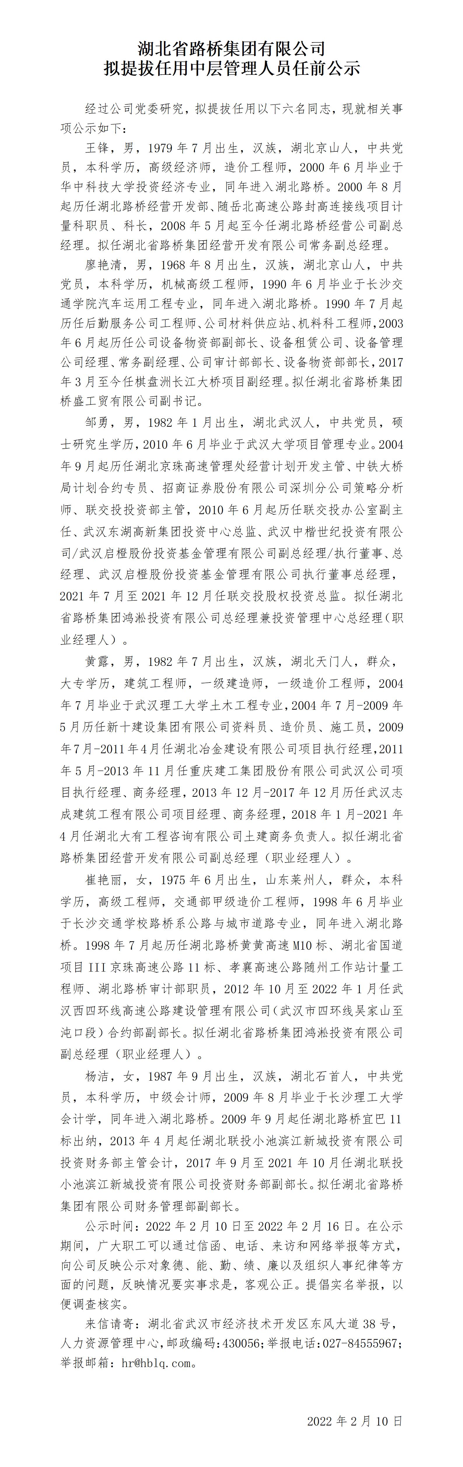 湖北省路橋集團(tuán)有限公司擬提拔任用中層管理人員任前公示