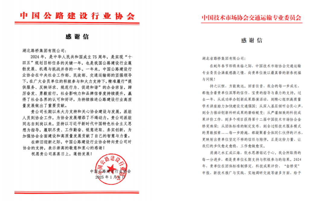 近日,湖北路橋收到來自中國公路建設行業(yè)協(xié)會、中國技術(shù)市場協(xié)會交通運輸專業(yè)委員會發(fā)來的感謝信,信中對湖北路橋大力支持和關(guān)心協(xié)會建設與發(fā)展,積極參與協(xié)會各項科技創(chuàng)新、評優(yōu)創(chuàng)獎活動表達了肯定與感謝。