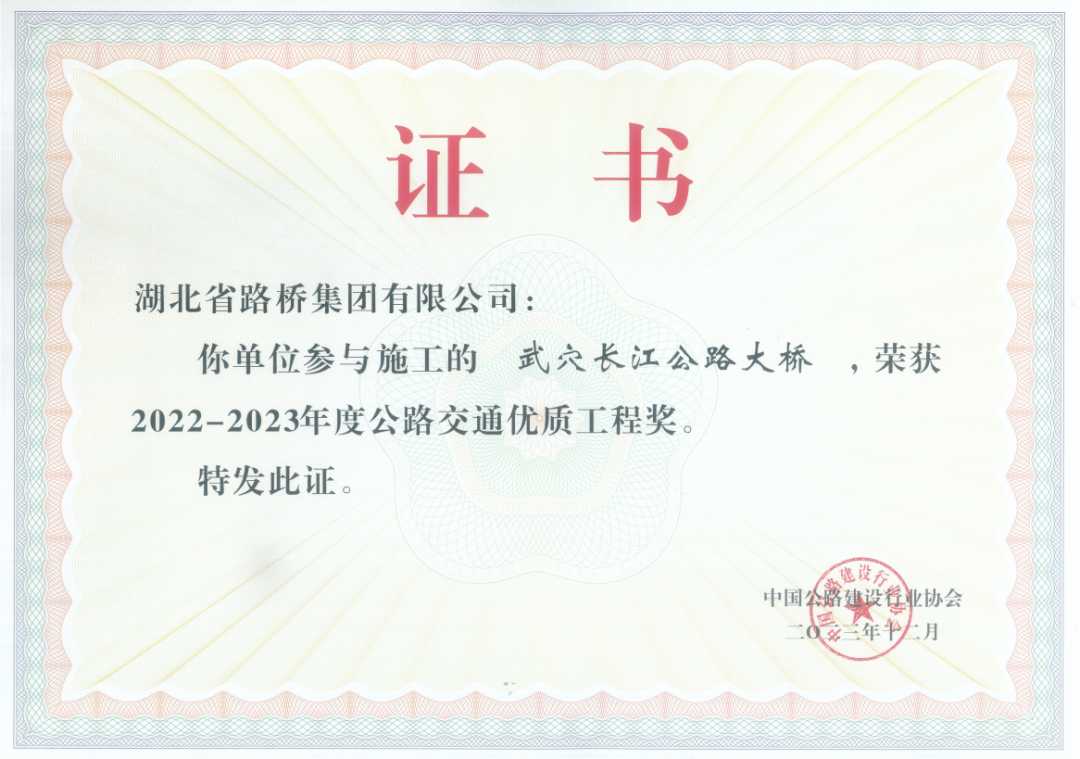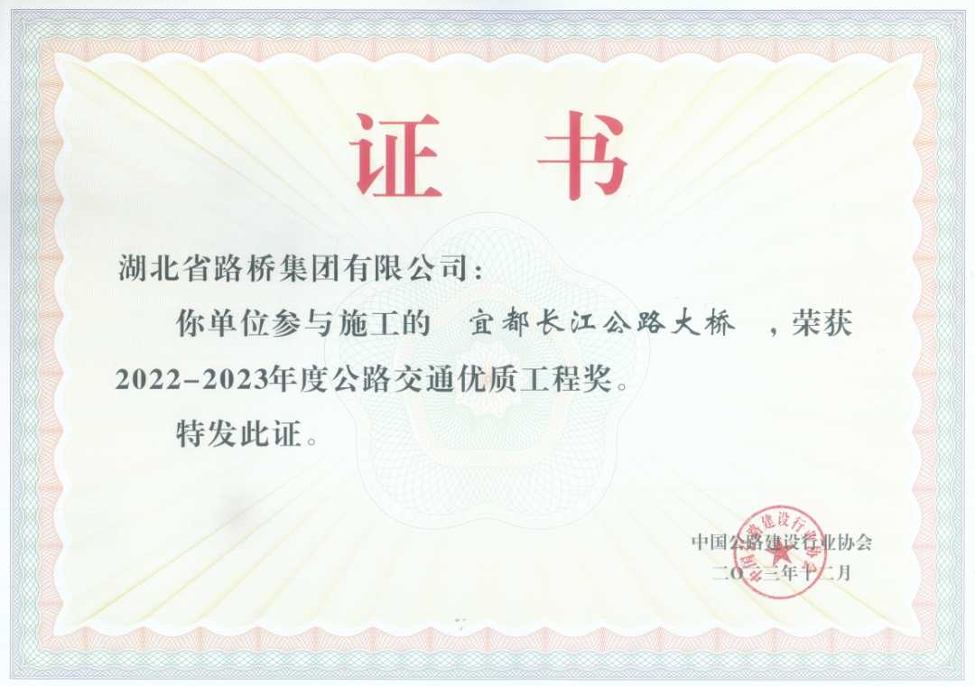 此外,湖北路橋一直致力于推動公路建設行業(yè)進步,并以積極開放的姿態(tài),深度參與行業(yè)協(xié)會各項工作。在中國公路建設行業(yè)協(xié)會的大力支持和指導下,湖北路橋憑借深厚的技術(shù)積累、不懈的創(chuàng)新精神以及對工程質(zhì)量的嚴格把控,取得了令人矚目的成績。15項工法在中國公路建設行業(yè)協(xié)會評為2024年度公路工程工法,宜都長江公路大橋、武穴公路長江大橋榮獲2022-2023年度公路交通優(yōu)質(zhì)工程獎(李春獎)的殊榮。