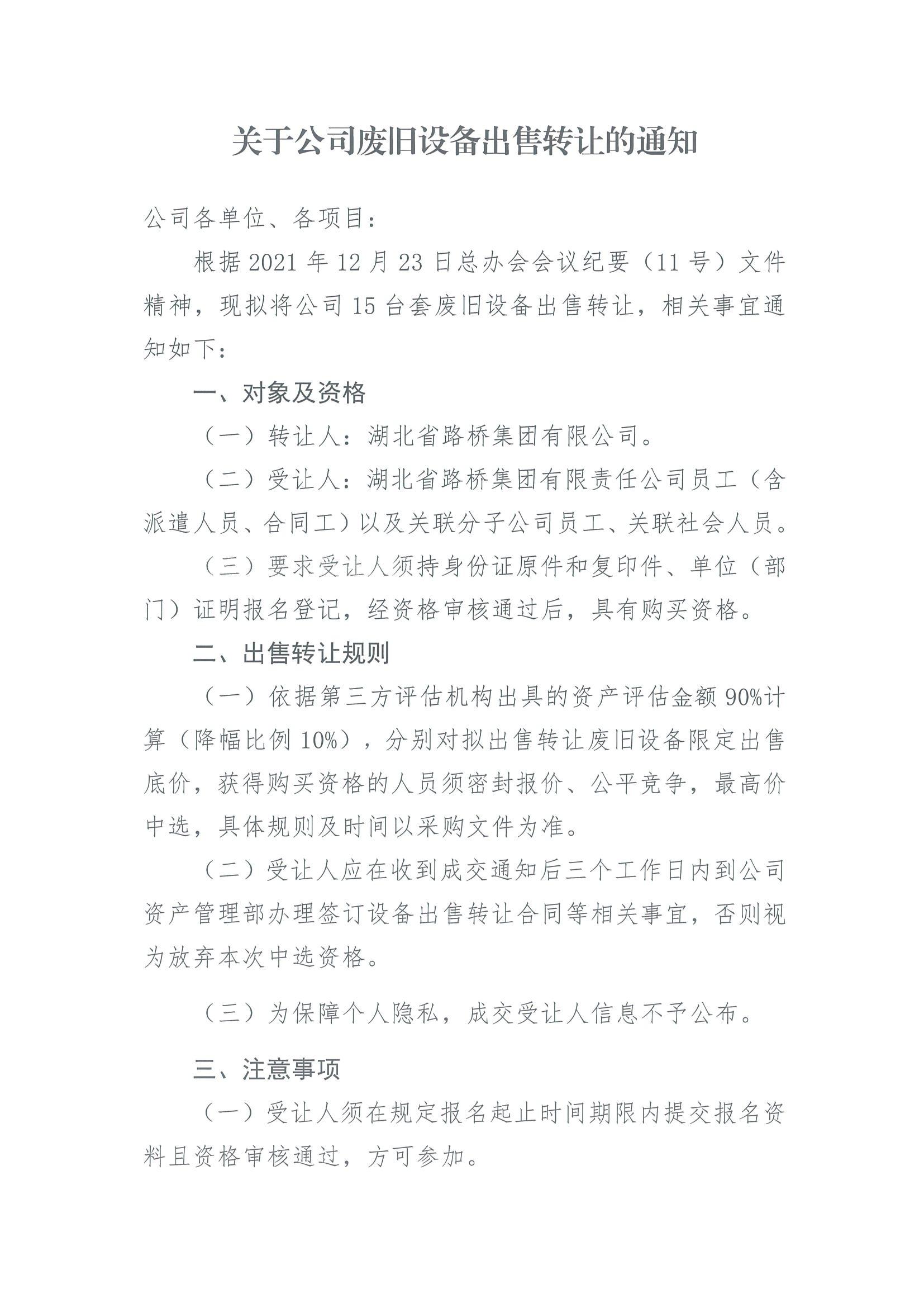 關(guān)于公司廢舊設(shè)備出售轉(zhuǎn)讓的通知