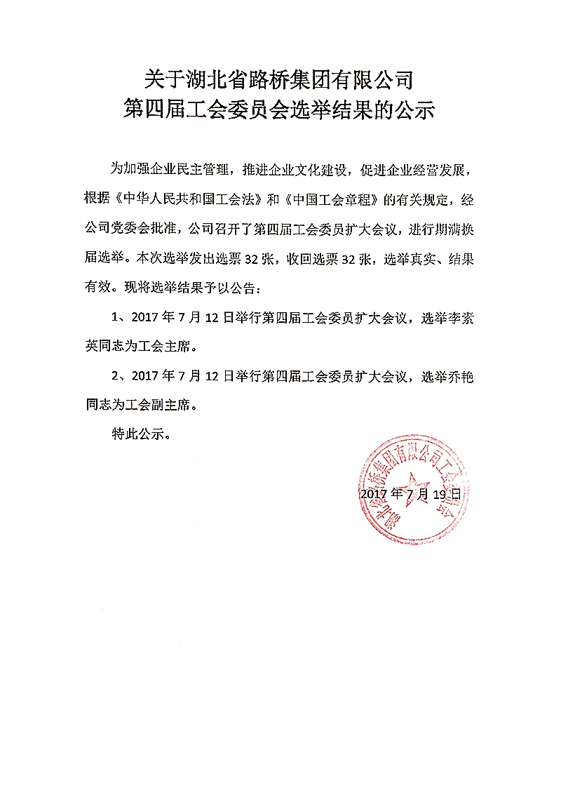 第四屆工會委員會選舉結(jié)果的公示