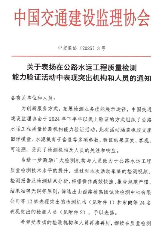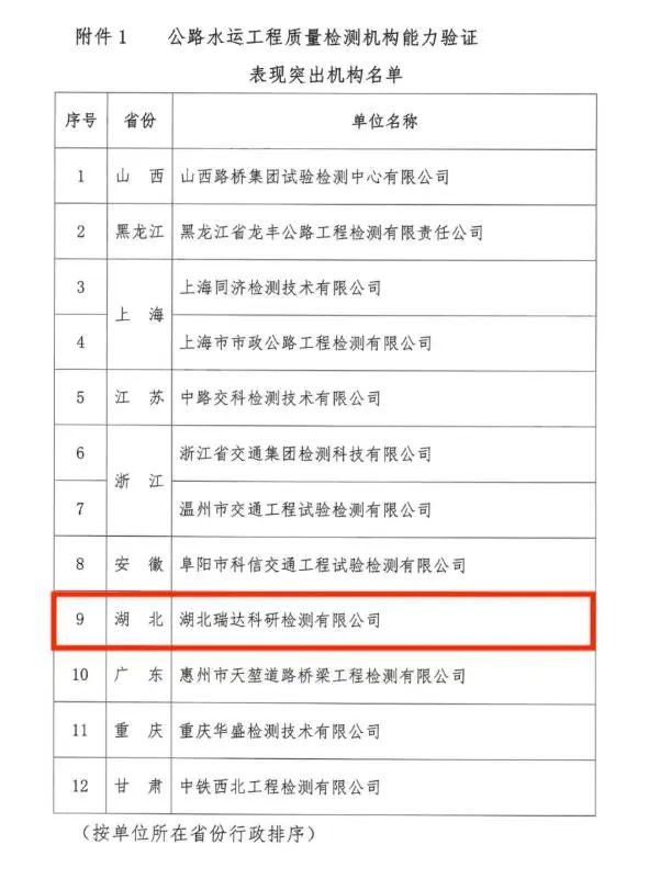 1月9日,中國(guó)交通建設(shè)監(jiān)理協(xié)會(huì)發(fā)布表彰通知,瑞達(dá)科研檢測(cè)公司成功蟬聯(lián)第二屆公路水運(yùn)工程質(zhì)量檢測(cè)能力驗(yàn)證“表現(xiàn)突出機(jī)構(gòu)” 榮譽(yù),是全省唯一一家連續(xù)兩屆獲此榮譽(yù)的檢測(cè)機(jī)構(gòu)。
